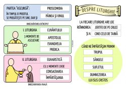 Planșa permite verificarea cunoștințelor despre Liturghie: cele trei părți ale ei, cu câteva momente mai importante; ce se întâmplă la Liturghie și ce primim în Împărtășanie… Conceperea planșei s-a bazat pe capitolul despre Liturghie din “Abecedarul credinței”.